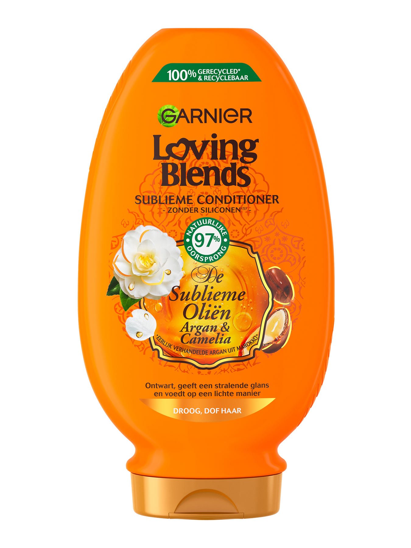 De Loving Blends Argan & Cameliaolie Conditioner van Garnier is speciaal ontwikkeld voor droog en dof haar. De voedende, glansgevende conditioner van 97% natuurlijke oorsprong bestaat uit twee sublieme oliën: