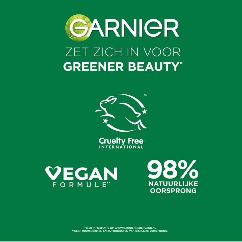 Garnier zet zich in voor Green Beauty. Ontdek voor nog meer verzorging de gehele routine. Garnier zet zich voortdurend in om de ecologische en sociale impact van haar producten te verminderen tijdens hun gehele levenscyclus, dus inclusief gedurende de productie- en gebruiksfase. Daarnaast streven wij ernaar om jou op een transparante manier toegang te geven tot deze gegevens, zodat jij beter geïnformeerde beslissingen kunt maken over welke producten je aanschaft. Daarom heeft Garnier het Product Impact Labelling Systeem geïntroduceerd. Om zo transparant mogelijk te zijn is deze methode ontwikkeld met de hulp van onafhankelijke wetenschappelijke experts en de gegevens zijn gecontroleerd door het onafhankelijke Bureau Veritas.