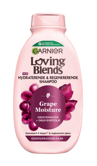 Garnier Loving Blends Grape Moisture Shampoo is een intens hydraterende shampoo speciaal ontworpen om gedehydrateerd haar intensief te hydrateren en de natuurlijke levendigheid ervan te herstellen. De formule, verrijkt met hydraterend druivenwater en antioxidantrijke druivenpitolie, beschermt het haar tegen dagelijkse schadelijke invloeden en helpt de vitaliteit van het haar te regenereren*. Geef je haar een ongekende hydratatieboost met de Garnier Loving Blends Grape Moisture Shampoo voor glanzend haar en tot 4 dagen non-stop hydratatie**. Ervaar de revitaliserende kracht van de Garnier Ultra Doux Grape Moisture Shampoo en geef uitgedroogd haar de ultieme hydraratieboost. De Loving Blends Grape Moisture lijn is geïnspireerd door de veerkracht van wijngaarden om de vitaliteit van je haar te herstellen en tot 4 dagen lang intensieve hydratatie te bieden*. De Garnier Loving Blends Grape Moisture Shampoo maakt je haar niet alleen direct glanzender en levendiger, maar beschermt het ook dankzij de antioxidanten in de formule. Bovendien zet Garnier zich in voor duurzaamheid: de fles is gemaakt van 100% gerecycled plastic***, en de formule is veganistisch en cruelty-free goedgekeurd.