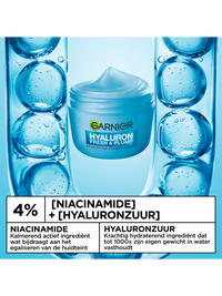 Ervaar de nieuwe generatie hydratatie met Garnier Hyaluron Fresh & Plump Hydraterende Sorbet Crème. Ontdek de ultra lichte en frisse textuur textuur en de crème biedt tot 48 uur* hydratatie. Verrijkt met Niacinamide en Hyaluronzuur. Niacinamide is een kalmerend actief ingrediënt wat bijdraagt aan egaliseren van de huidteint. Hyaluronzuur is een krachtig hydraterend ingrediënt dat tot 1000x zijn eigen gewicht in water vasthoudt. Deze ultra lichte crème hydrateert en geeft volume aan de huid. Garnier Hyaluron Fresh & Plump Hydraterende Sorbet Crème is geschikt voor de gevoelige huid en voor alle huidtinten. Dermatologisch getest.