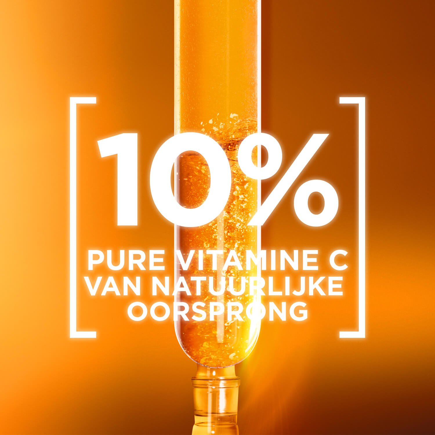 Breidt jouw routine uit met het Garnier Skinactive 10% Pure Vitamine C Anti-Pigmentvlekken Nachtserum met Hyaluronzuur. Na 3 jaar wetenschappelijk onderzoek is ons laboratorium erin geslaagd om onze hoogste concentratie puur vitamine C [10%], van natuurlijke oorsprong te stabiliseren in een minimalistische formule dit is het eerste nachtserum met een hoge concentratie pure vitamine c van natuurlijke oorsprong, en is bewezen doeltreffend in het verbeteren van de huid. De antioxidant vitamine C staat bekend om de eigenschap om een doffe huid een stralend effect te geven. Daarnaast bevat het serum hyaluronzuur, een bekend actief ingrediënt wat helpt om de huid intensief te hydrateren en te verzachten. De vegan formule is geaccrediteerd cruelty free volgens het Leaping Bunny Programma.