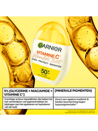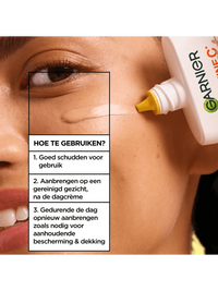 Ontdek de volledige Garnier Vitamine C* Routine: Stap 1: Start met het Vitamine C* Micellair water en/of Vitamine C* Gentle Gel Cleanser. Stap 2: Gebruik 's ochtends Garnier Vitamine C+* Glow Booster Serum voor een stralendere huid met minder pigmentvlekken en gebruik. Breng 's avonds Brightening Night Serum aan na het reinigen, om pigmentvlekken te verminderen, dofheid en fijne lijntjes te verminderen. Stap 3: Gebruik na het aanbrengen van een serum de Garnier Vitamine C* Fresh & Bright Hydraterende Sorbet Crème voor hydratatie die in de huis smelt met een ultralichte en frisse textuur. Stap 4: Voor overdag, sluit je routine af met een Garnier Daily UV fluid in Glow of Invisible om de huid te beschermen tegen UVA en UVB straling met SPF 50.