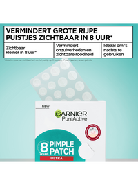 Garnier PureActive Pimple Patch Ultra biedt een revolutionaire oplossing voor het verminderen en beschermen van grote, rijpe puistjes met bewezen resultaten. Deze ultra krachtige hydrocollïde patches zijn 420 micron dik en vormen een beschermende laag over puistjes voor optimale absorptie van vocht en vuil. De patches zijn speciaal ontworpen om puistjes zichtbaar te verminderen in slechts 8 uur*, waardoor ze ideaal zijn voor nachtelijk gebruik. Met een dikte die 40% meer** is dan standaard patches, bieden ze 2x meer absorptie**. De hydrocollïde technologie trekt onzuiverheden uit de poriën terwijl het de huid beschermt tegen externe bacteriën en vervuiling. Bewezen resultaten tonen aan dat 94% van de gebruikers bevestigt dat hun onzuiverheden geen vlekjes achterlieten, en 96% is het ermee eens dat de patch beschermt en puistjes minder zichtbaar maakt***. Het product is getest onder dermatologische controle.