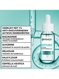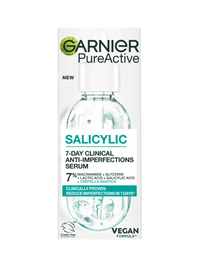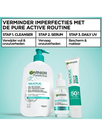 Ontdek ons eerste anti-imperfecties serum: Garnier Pure Active Salicylic Anti-Imperfecties Serum, de formule die klinisch bewezen onzuiverheden zichtbaar vermindert in 7 dagen*. De formule is verrijkt met niacinamide + glycerine + melkzuur + salicylzuur + centella asiatica. Het Garnier Pure Active Salicylic Anti-Imperfecties Serum gaat 6 tekenen van onzuiverheden tegen: puistjes, roodheid, vettigheid, vlekjes na puistjes, vergrootte poriën en een oneven textuur. Het is een snel absorberende lichtgewicht formule met klinisch bewezen effectiviteit: zo voelt de huid direct gladder**, in 3 weken -44% minder onzuiverheden* en biedt het 8 uur lang oliecontrole***. Nieuwsgierig naar de werkzaamheid van de actieve ingrediënten? Niacinamide vervaagt achtergebleven vlekjes na puistjes, glycerine hydrateert & verzacht de poriën, melkzuur verbetert de huidtextuur, salicylzuur exfolieert onzuiverheden en centella asiatica kalmeert de huid. Het serum is getest onder dermatologische controle en is geschikt voor de gevoelige huid. Ontdek de volledige Ganier PureActive Salicylic Routine: Stap 1: Reinig de huid met de Garnier PureActive Salicylic Anti-Imperfecties Gezichtsreinigingsgel. Stap 2: Verzorg de huid na het reinigen met de Garnier PureActive Salicylic Exfoliërende Liquid Care om poriën te verfijnen en de teint te egaliseren. Stap 3: Breng het Salicylic Serum aan om onzuiverheden zichtbaar te verminderen. Stap 4: Gebruik zowel 's ochtends als 's avonds de Garnier Salicylic Fresh & Matte hydraterende Sorbet gezichtscrème, en gebruik overdag eventueel nog de UV fluid om de huid te beschermen. Stap 5: Verminder en bescherm puistjes met de Garnier Pure Active Pimple Patches