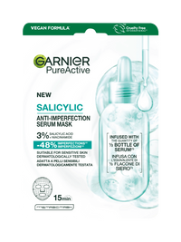 Garnier PureActive Salicylic Anti-Imperfection Serum Mask is een innovatief tissue masker met salicylic anti-imperfecties serum dat speciaal is ontwikkeld voor imperfecties en zichtbare poriën. Dit krachtige masker verzorgt de huid in slechts 15 minuten en is doordrenkt met de hoeveelheid van een ½ flesje serum*. Het masker is verrijkt met Niacinamide en Salicylzuur, twee bewezen actieve ingrediënten die om imperfecties tegen te gaan. De formule biedt een intensieve verzorging waarbij in 15 minuten -39% talgniveau* wordt bereikt, 82% zag een intens gehydrateerde huid** en 89% zag een gladdere huid**. Na 1 maand gebruik toont het masker indrukwekkende resultaten: -48% imperfecties*, -39% mee-eters* en 80% zag een gladdere huid*. De huid wordt merkbaar verbeterd met -48% minder zichtbare poriën* en een algemeen helderder uitziende huid. Het Garnier PureActive masker is gebaseerd op de hoeveelheid van een serum van 28 ml, waardoor het een geconcentreerde behandeling biedt die vergelijkbaar is met een volledige serumbehandeling. De tissue masker formule zorgt ervoor dat de actieve ingrediënten optimaal kunnen inwerken voor maximale resultaten. Voor gebruik het masker aanbrengen op een gereinigde huid en 15 minuten laten inwerken. Na gebruik hoeft u niet af te spoelen - masseer eventuele resterende essence zachtjes in de huid.